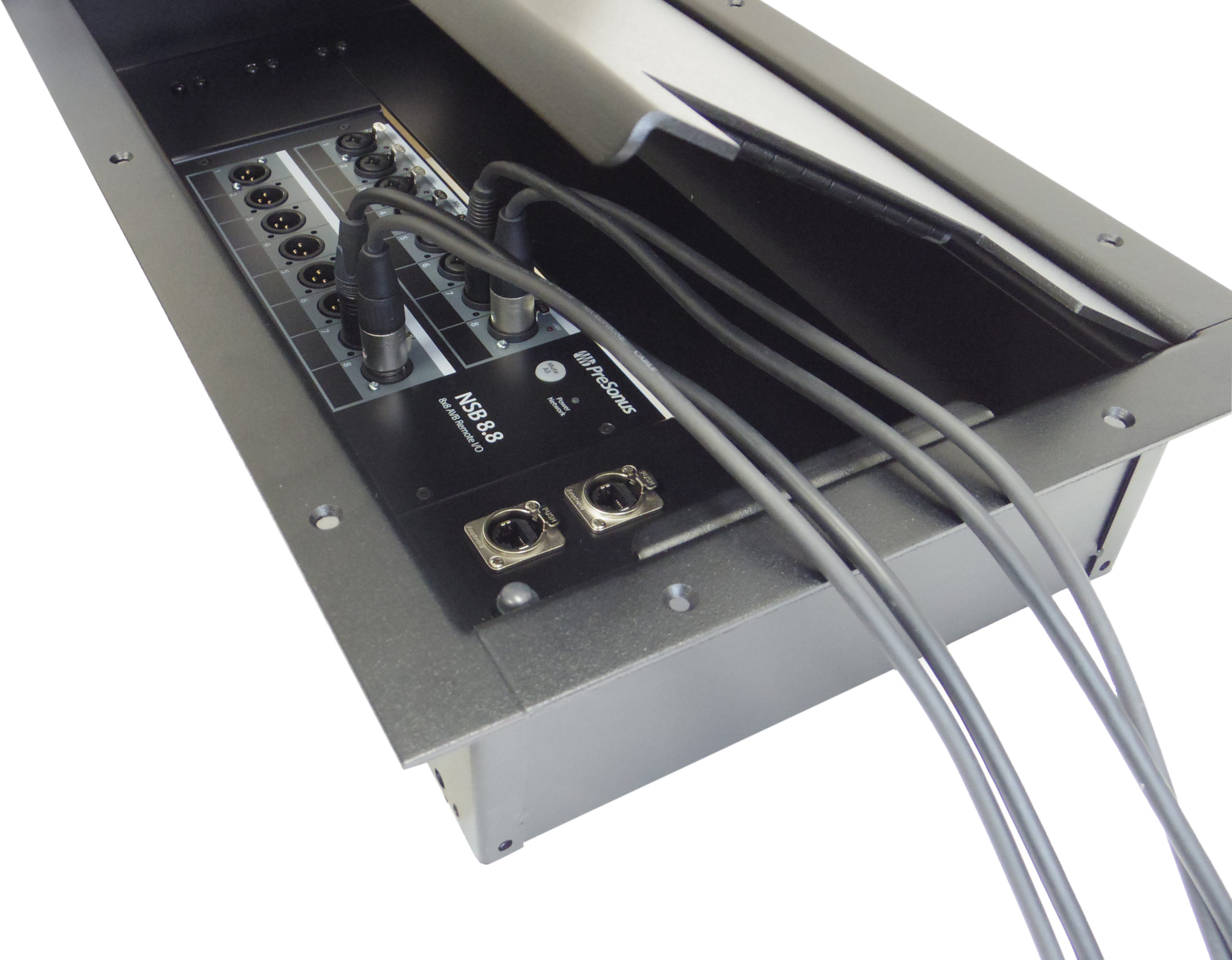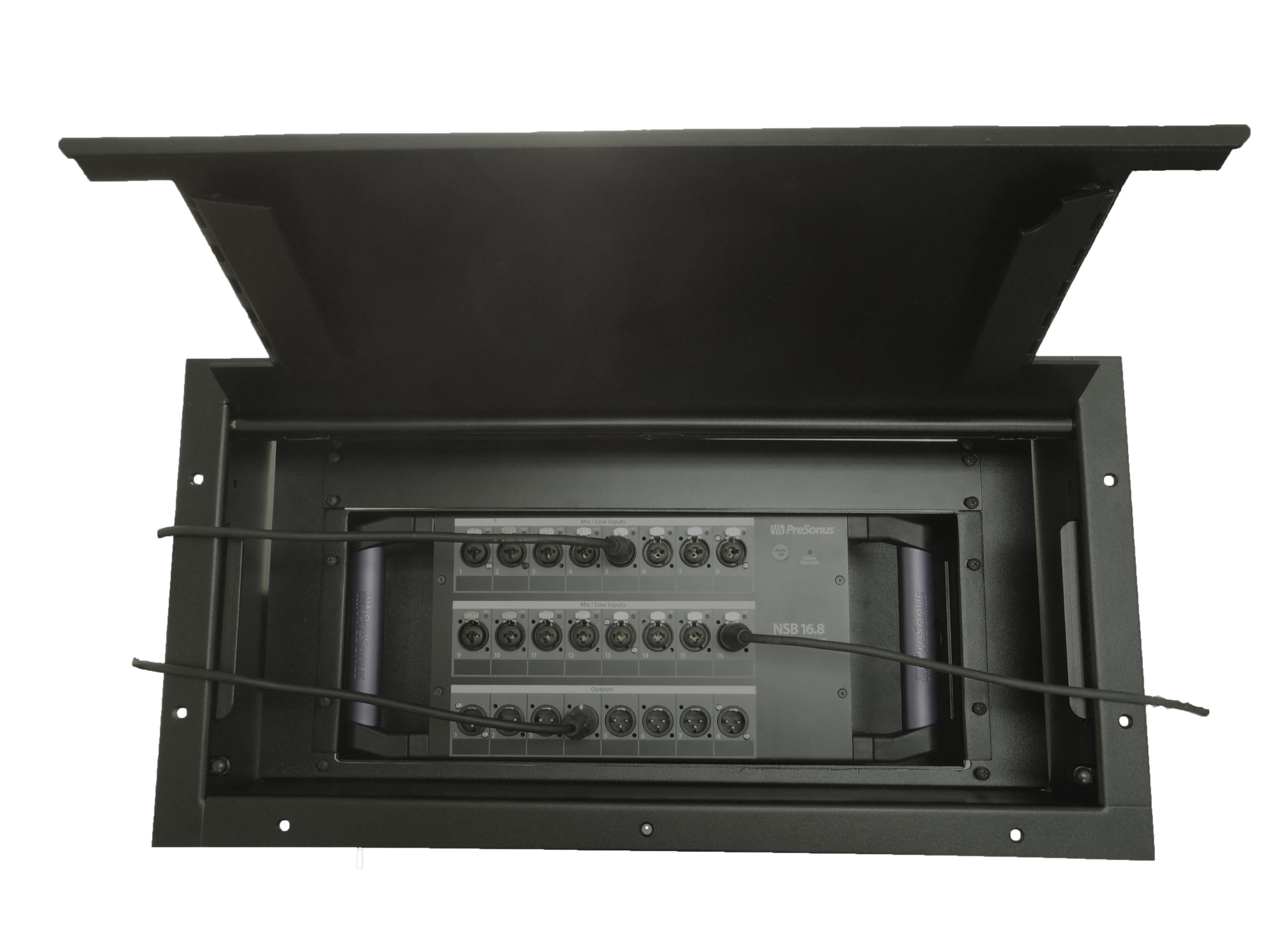 Configured to receive a PreSonus NSB Stage Box (NSB 8.8 or 16.8), this permanent install Partnership Pocket allows the PreSonus piece to securely rest in the 175 Stage Pocket nesting frame while connectivity cables egress neatly onto the stage floor through dual hinged cable exits in the pocket lid