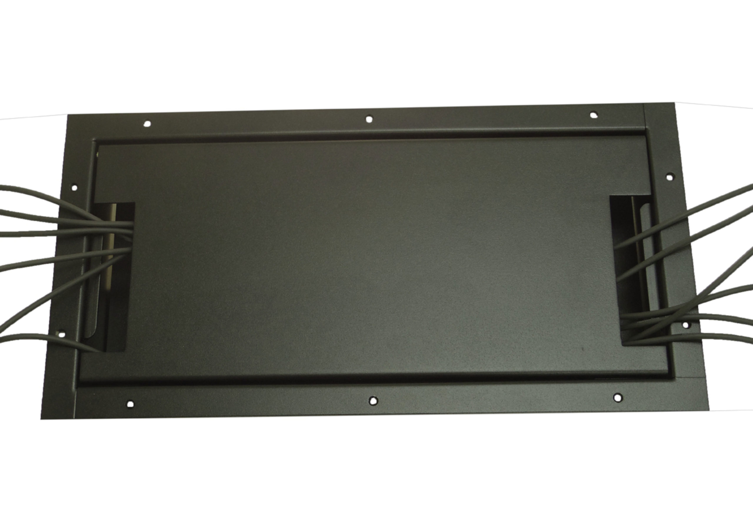 solid steel lid is designed to resist bending even under the most severe stage load. Dual hinged cable exits on opposing sides of the Stage Pocket lid pivot down to allow many cables to exit, or pivot flush to close all openings.